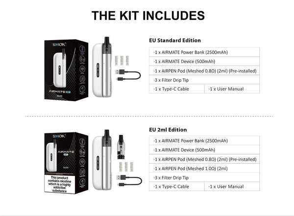 The SMOK AIRMATE PCC Kit combines minimalist elegance with powerful practicality. Featuring the ultra-compact AIRPEN pod system and a stylish 2500mAh magnetic power bank, this kit is engineered for modern on-the-go vaping. The 500mAh AIRMate Pod offers up to 15W output, a 2ml refillable pod, and a replaceable filter drip tip for a customizable inhale. Its sleek, pen-shaped body fits perfectly in hand, while the magnetic PCC case ensures secure charging and extended battery life wherever you go.