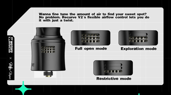Introducing the Wotofo newest collaboration with Mike Vape--the Recurve V2 RDA an exciting upgrade of the once popular Recurve and has a diameter of 24.6mm, 35.55mm Height with the drip Tip, As for the top cap to the RDA body, it inherits the curved appearance of the first generation and is addictive. It is structured to support both dual build of 3mm ID coils and single build of 5mm/3mm ID coils, offering you user-friendly coil tools to DIY, it also includes two 3mm thick cotton strips and one 5mm thick cotton strip to be stuffed in the two large wicking ports, one on each side of the deck. The juice well can cater to 2ml vape juice, along with its two air intakes located on the side with its different-sized slots.Two airflow adapters are included for the purpose of flavor enhancement .The slot-honeycomb combination smoothly softens the air inflow and directs it right onto the heating coil , mixing it with the vaporized e-juice in the reduced chamber that is formed by the adapter , and sending the flavorful vapor up to your mouth . There’s just enough room on either side of the squared section for your coil legs, it gets some fancy tools for you to rebuild your handmade aliens, and according to its postless deck, it is easy to build and is squonkable with the provided pin in the accessory bag. Overall, it has a better and more suitable flavor than regular coils due to its DIY,