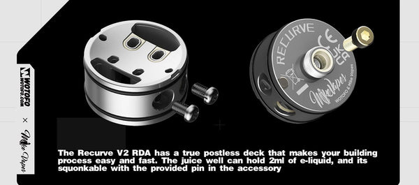 Introducing the Wotofo newest collaboration with Mike Vape--the Recurve V2 RDA an exciting upgrade of the once popular Recurve and has a diameter of 24.6mm, 35.55mm Height with the drip...