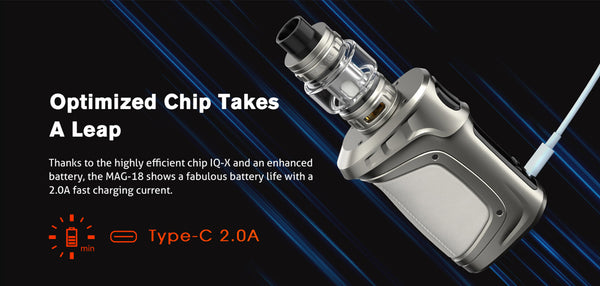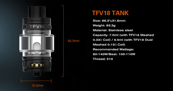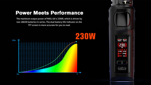 The Mag-18 has a maximum power of 230W from dual 18650 batteries accessible by way of a bottom cap.(bypass mode, variable wattage mode, TC mode,) The cells can be recharged via a 2 amp fast-charging USB-C interface that will conclude the procedure in practically no time at all. paired with the powerful 7.5ml TFV18 Tank and two TFV18 meshed coils, allowing you to enjoy huge clouds and delectable flavors for a sustainable vaping experi-ence. the touchscreen has been replaced by an exquisite 0.96inch TFT display with full-color UI. Smok TFV18 Tank that is capable of holding up to 7.5ml of your favorite e-liquid with the TFV18 mesh coils(0.15ohm and 0.33ohm),Both of these heads operate in the range of 80 to 140 watts.