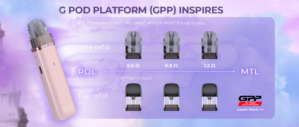 Cartridge Specifications: FeCrAl Meshed 0.6ohm Caliburn G3 Integrated Coil Cartridge (side refill)(INT./FDA), FeCrAl Meshed 0.9ohm Caliburn G3 Integrated Coil Cartridge (top refill)(TPD)