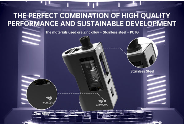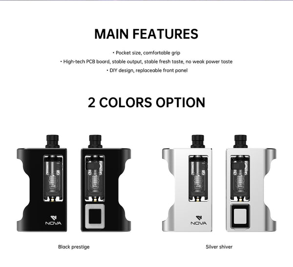 Vandy Vape Nova AIO Kit offers a 5-60W adjustable power range and is compatible with RBA for vaping DIY lovers. The clear 0.42-inch OLED screen display shows essential vaping information, including wattage, coil resistance, and battery life. Constructed from zinc alloy, the NOVA AIO kit has three drip-tip airflow pipes with different apertures. Powered by an external single 18650 battery (not included), the Vandy Vape kit provides flexibility in power management. Accommodating 6ml vape juice capacity, easy side filling, and VDP 2.0 technology for enhanced performance. Customizable panels and safety features like short-circuit protection make it a versatile choice. Find disposable vapes near me for a convenient vaping experience.